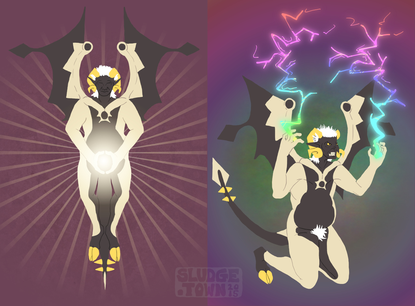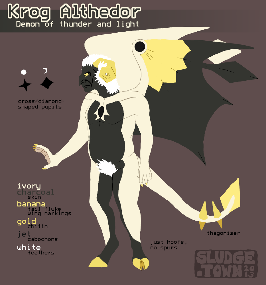Krog's cross-shaped pupils and powers of light occasionally lead them to being mistaken for an angel by ignorant humans, much to Krog's great annoyance.