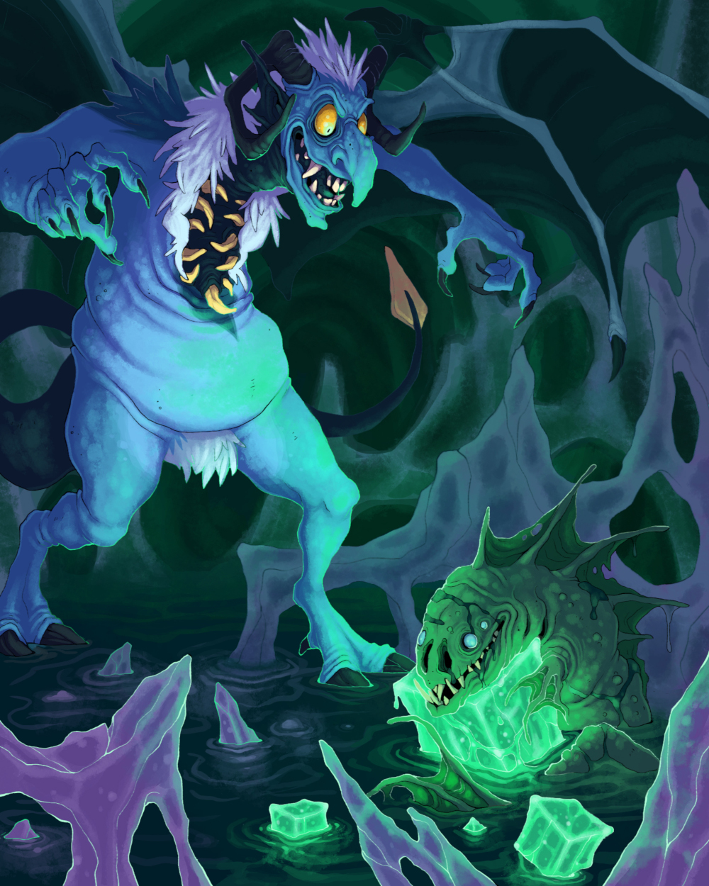I commissioned Facerot to draw a scene with Murgatranthes in a cave, and that it should somehow include fish, cubes and crystals. This is what I got! That fish loves his cubey crystal... but watch out!