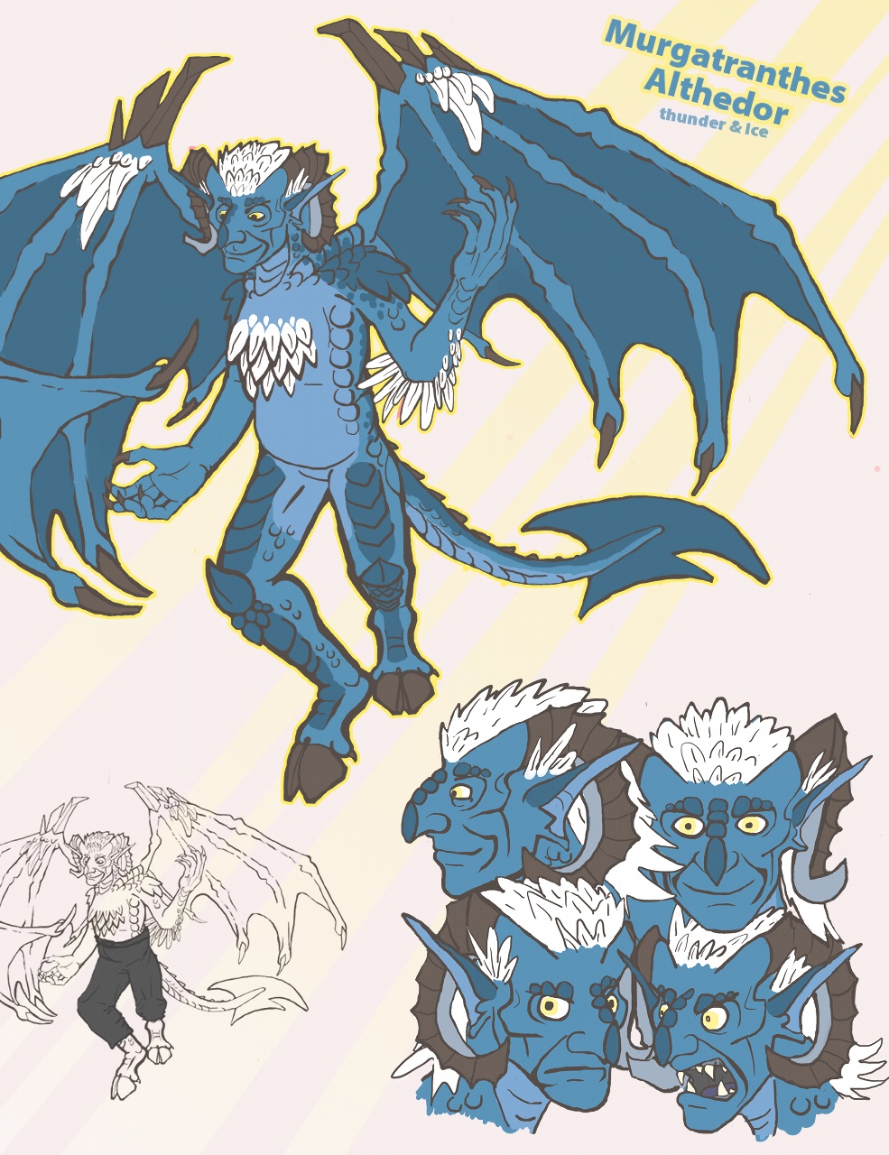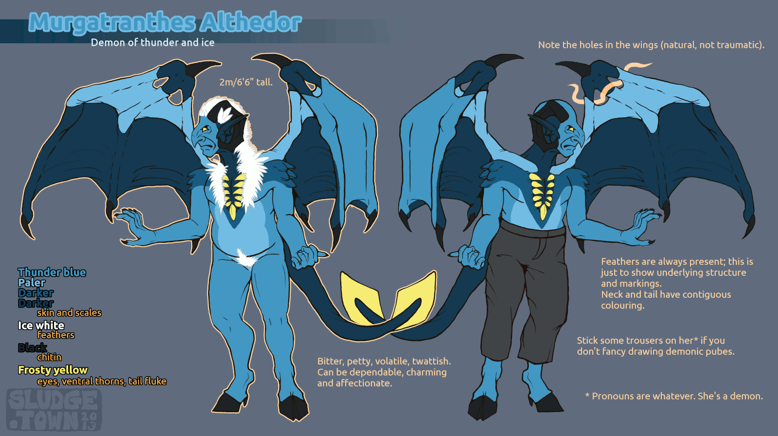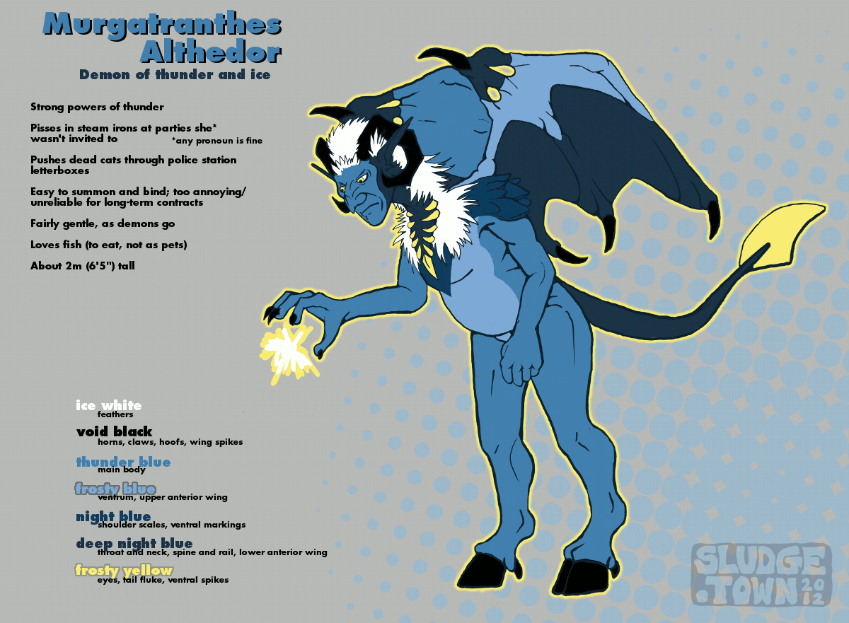 Murgatranthes' design developed organically over the years, getting tweaked and more ornate but still keeping the same basic design. By 2012, I realised that while I still liked Murgatranthes' design, it was too messy and full of pieces that were only there through historical inertia. Below is the last pre-redesign refsheet, from 2011.