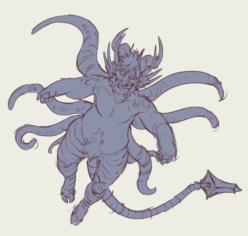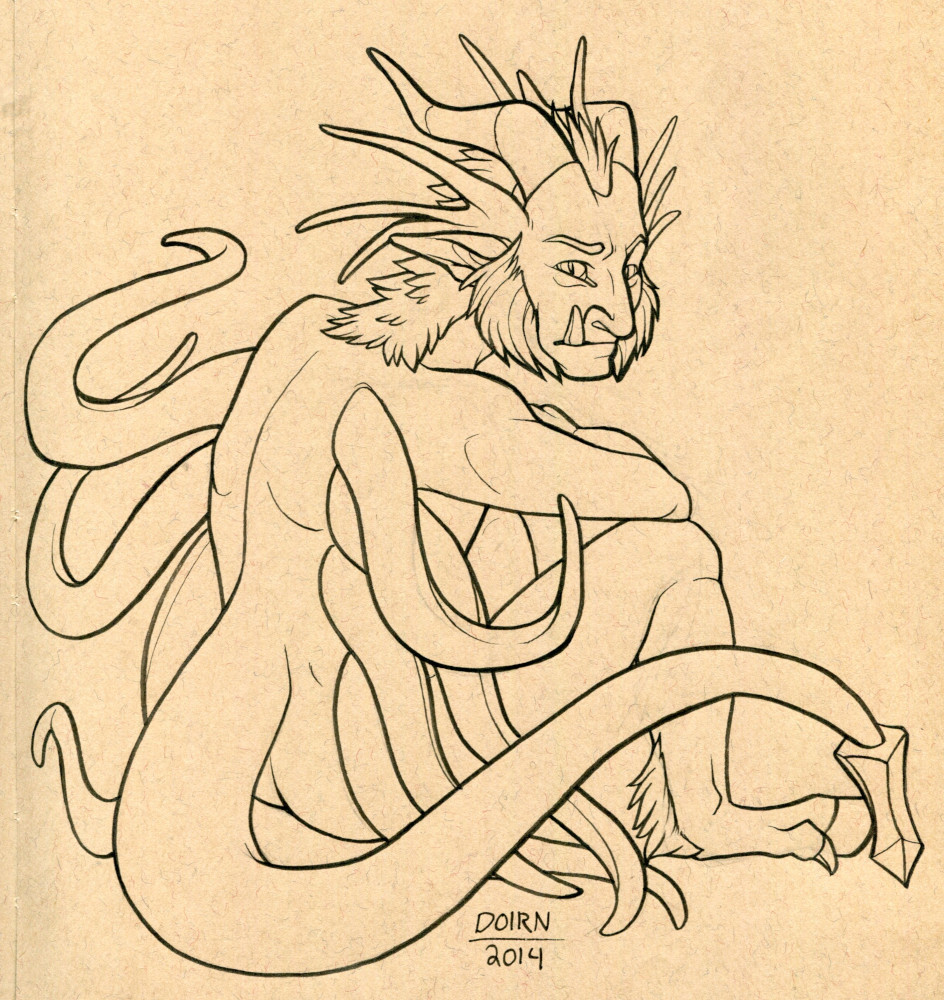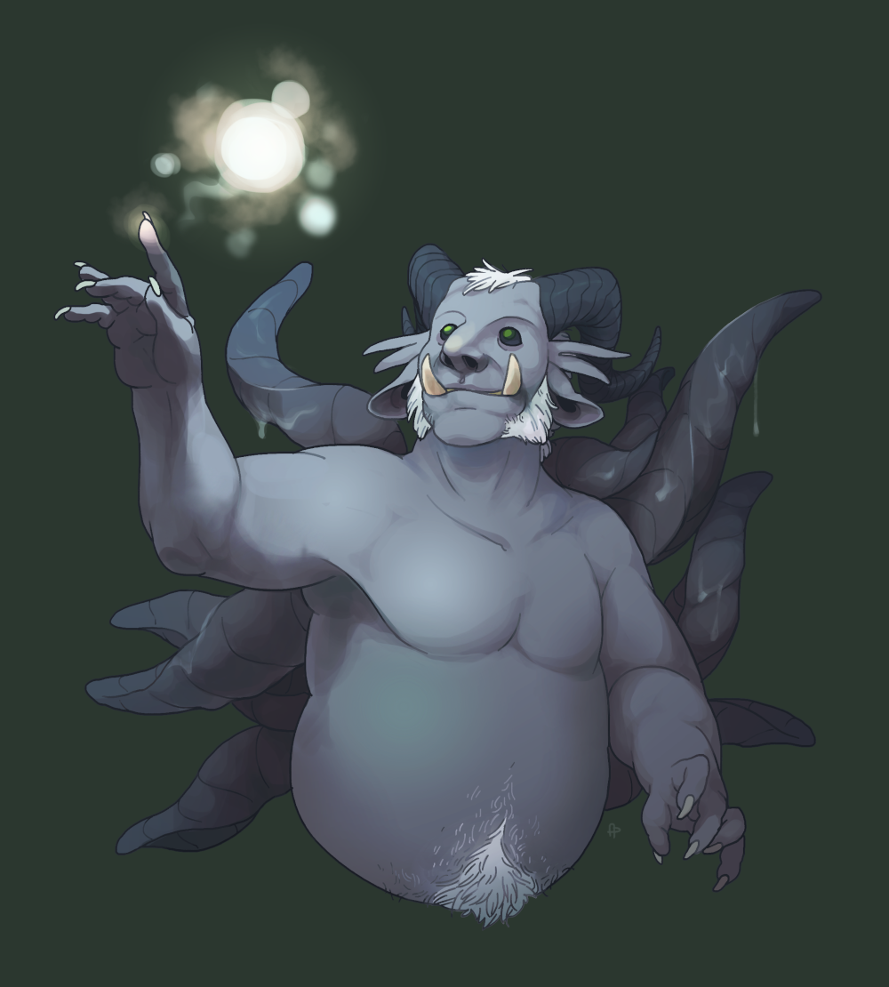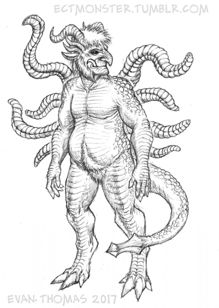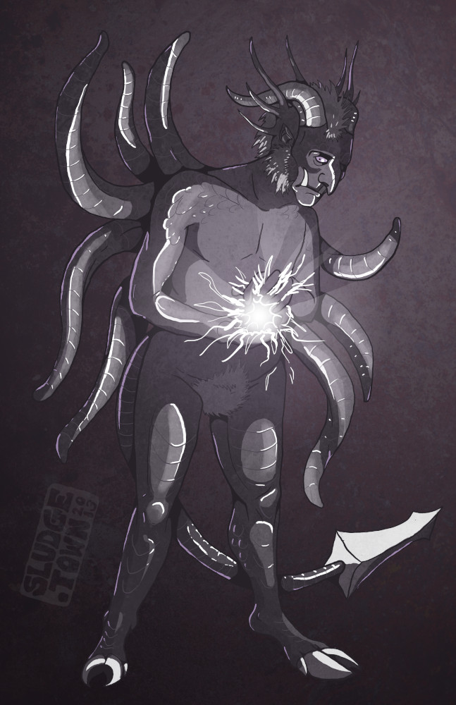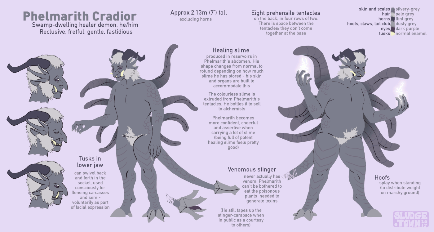 Phelmarith was born with vestigial wings, and had them amputated when his tentacles started coming through and the wings got in their way. Phelmarith is a little bigger than average for a rathameldhontel, because he managed to devour all of his clutch-mates at birth. (This is not as horrific as it sounds: rathameldhontel are born as incorporeal wisps of magic and become corporeal after a few hours.)